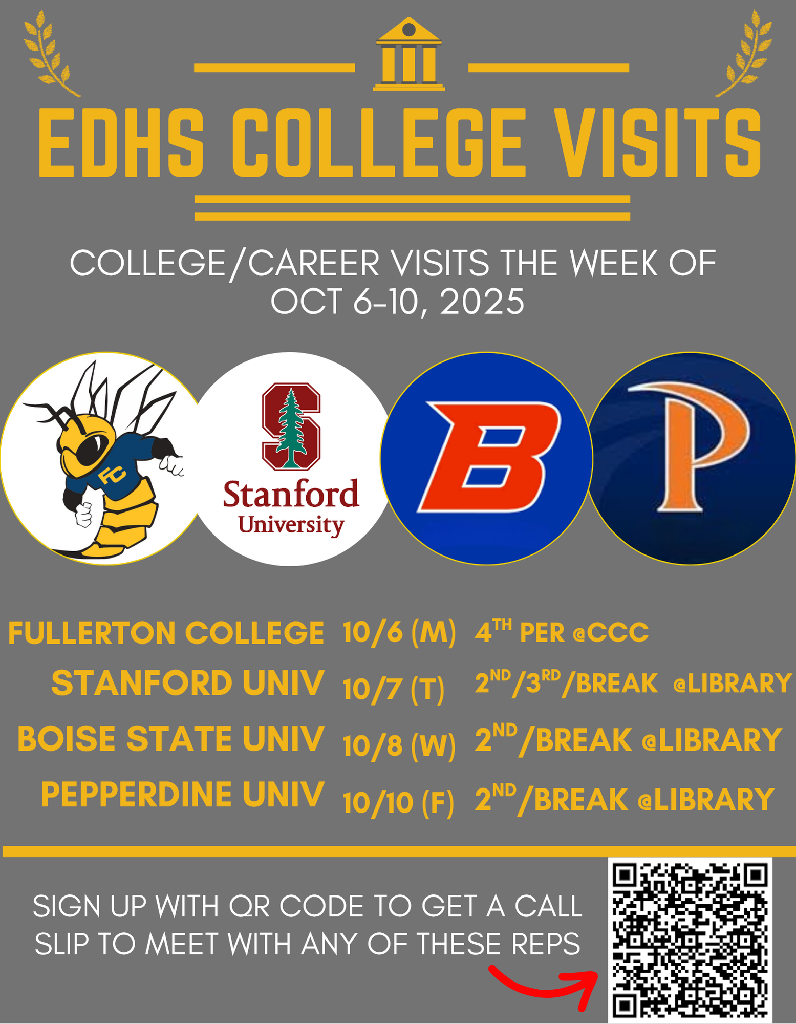 College Visits @ EDHS You can click HERE or scan the QR code to get a call slip to visit with a college rep.