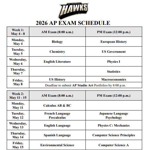 2026 AP Testing Schedule Please see the attached schedule for date, time, and location of each of the AP Exams. Attached Files AP Exam Dates 2026.pdf